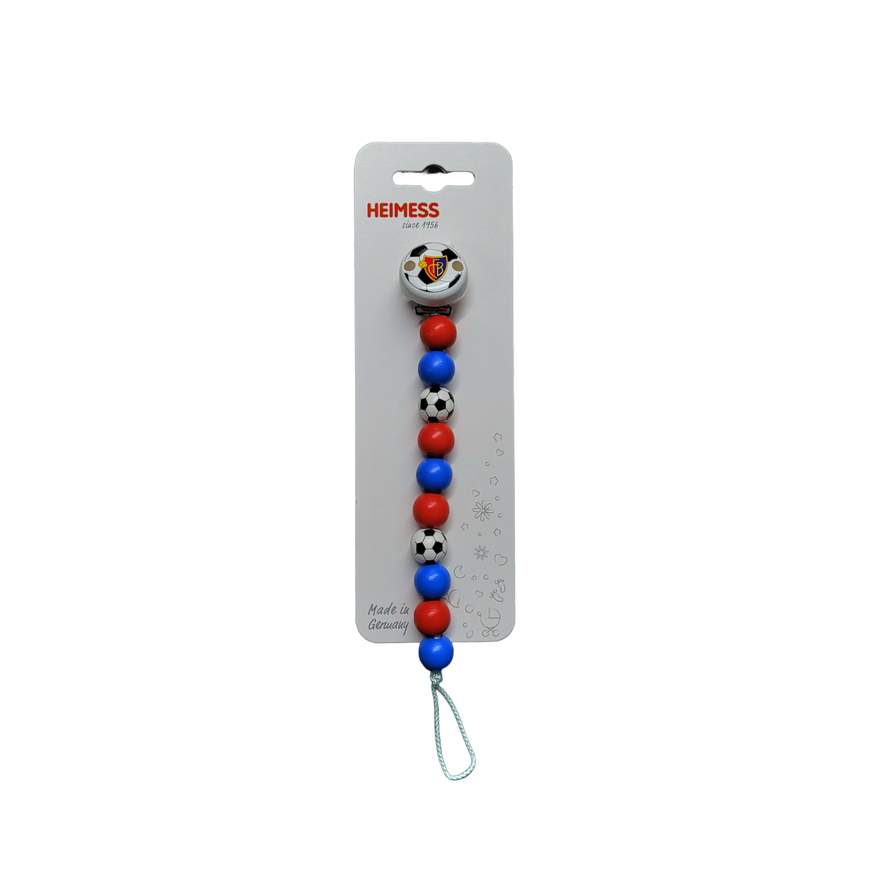 Die FCB-Nuggikette ist aus Holzperlen gefertigt und mit dem FCB-Wappen auf dem Clip bedruckt.