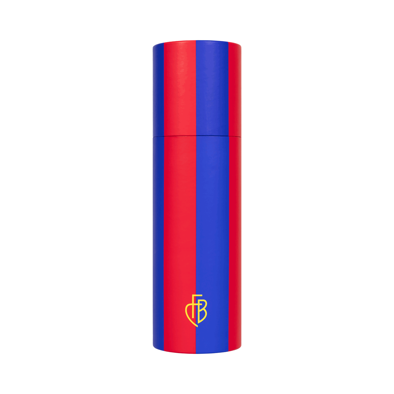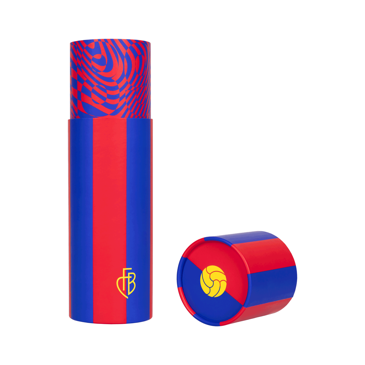 Zylinderförmige Geschenkverpackung im FC Basel-Design.