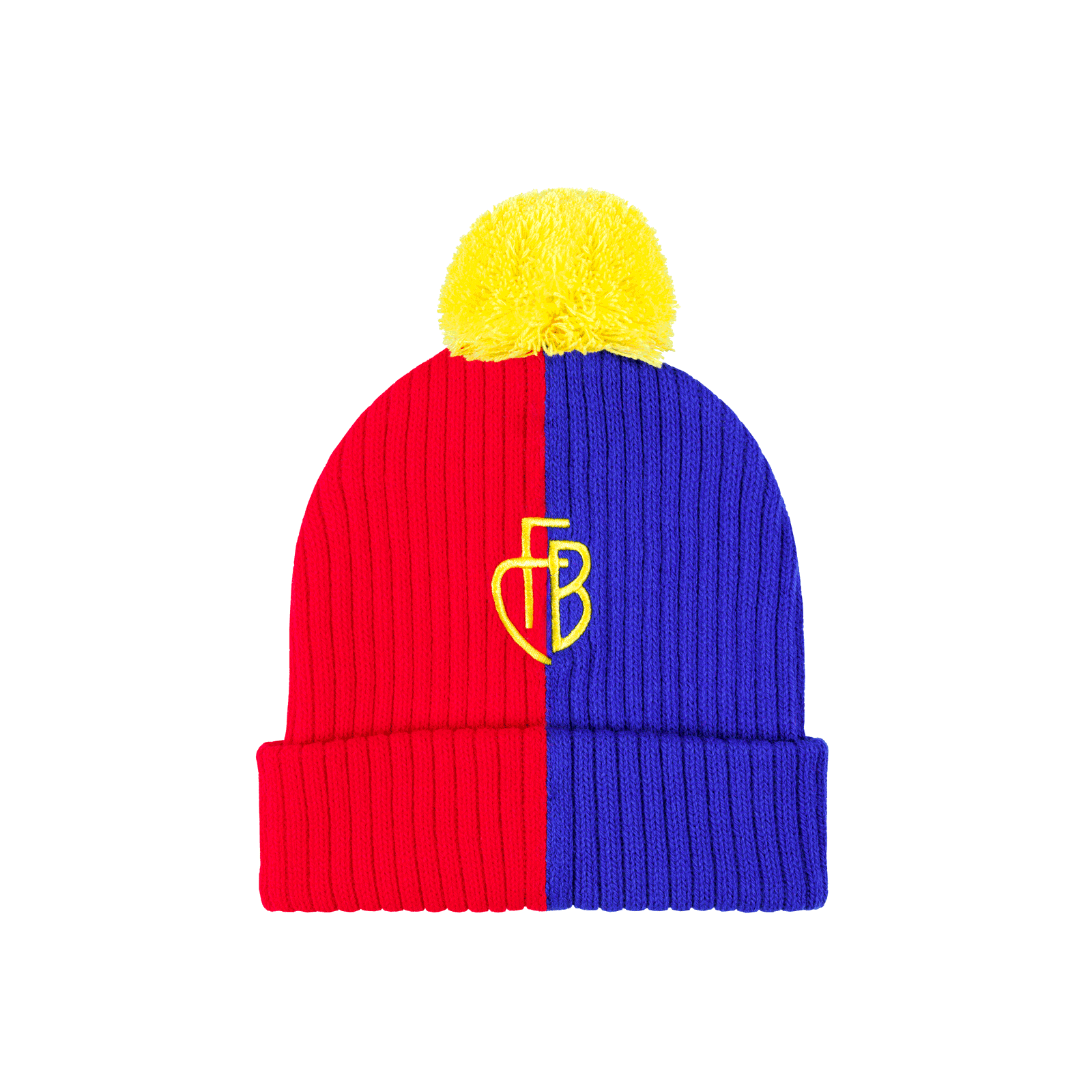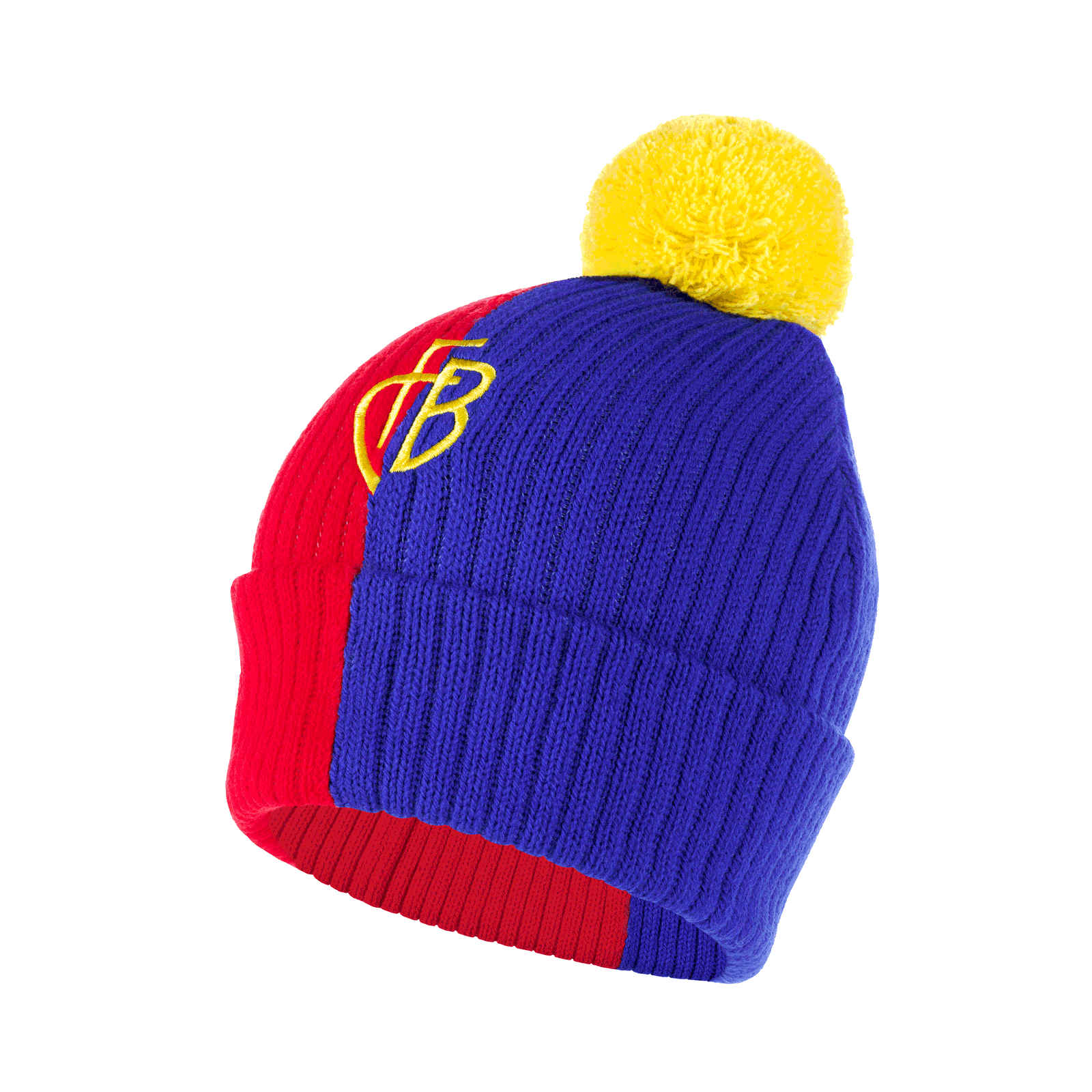Rotblaue Bommel-Mütze für Kinder mit gesticktem FCB-Monogramm.