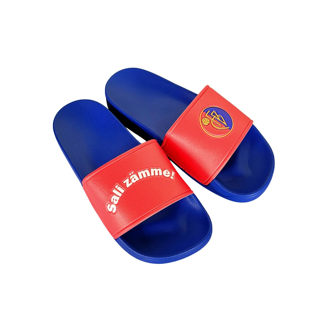 Badesandalen mit geprägtem Schriftzug und Logos auf den Riemen.