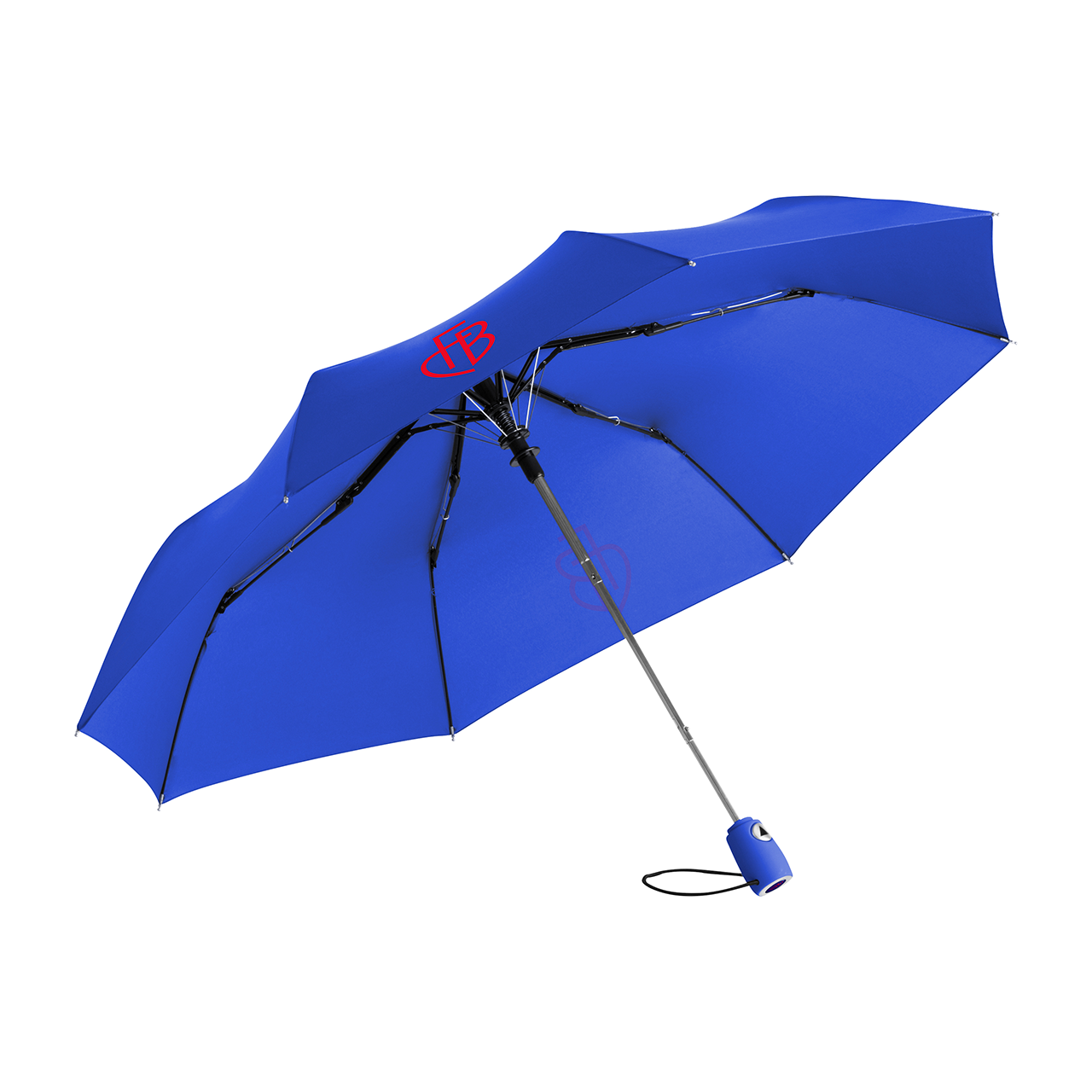 Mini Taschenschirm mit rotem Monogrammdruck auf zwei Panels und bei Griff.